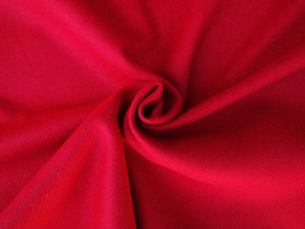 Silnější vlněné sukno královsky červené barvy se znatelnou keprovou vazbou.
