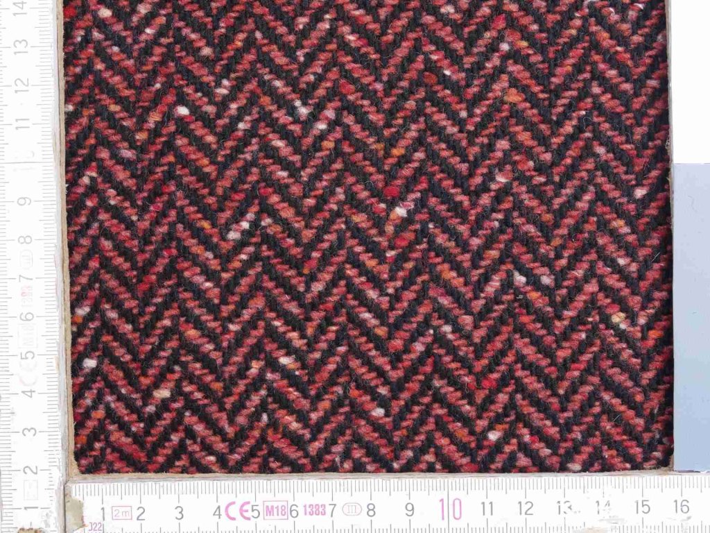 Silnější vlněná rybí kost utkaná z černé a zrzavě hnědé příze s bílými nopky.