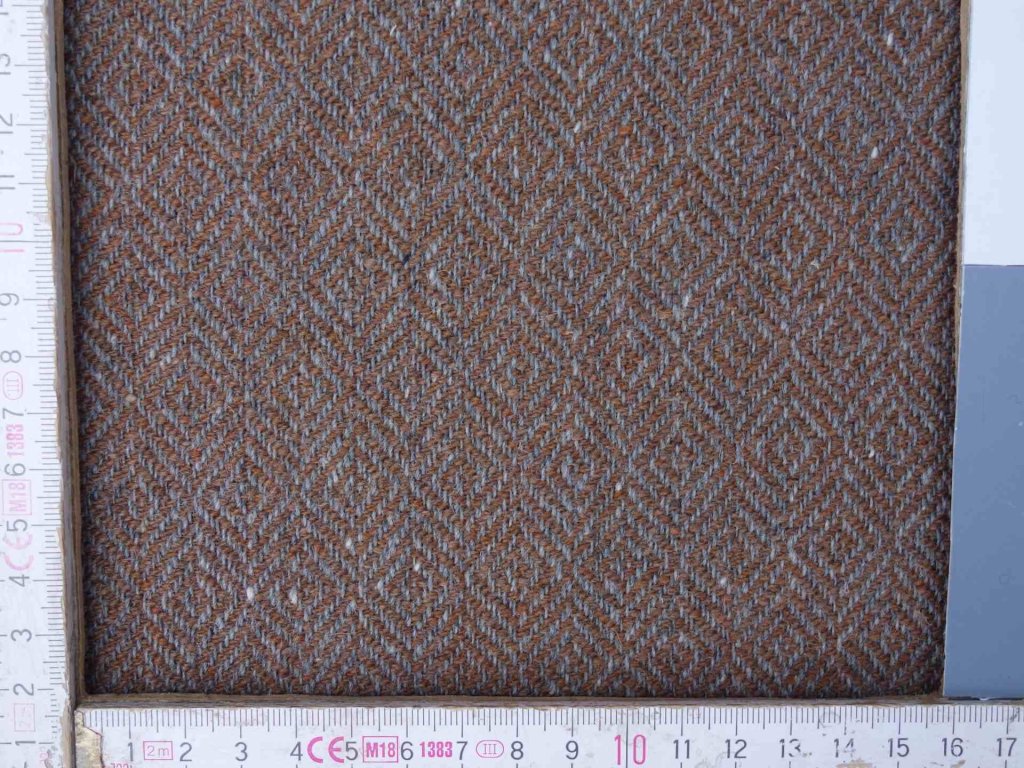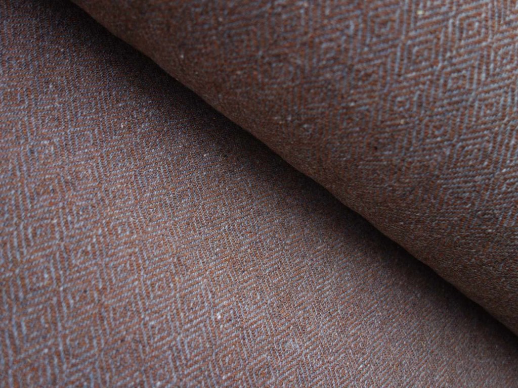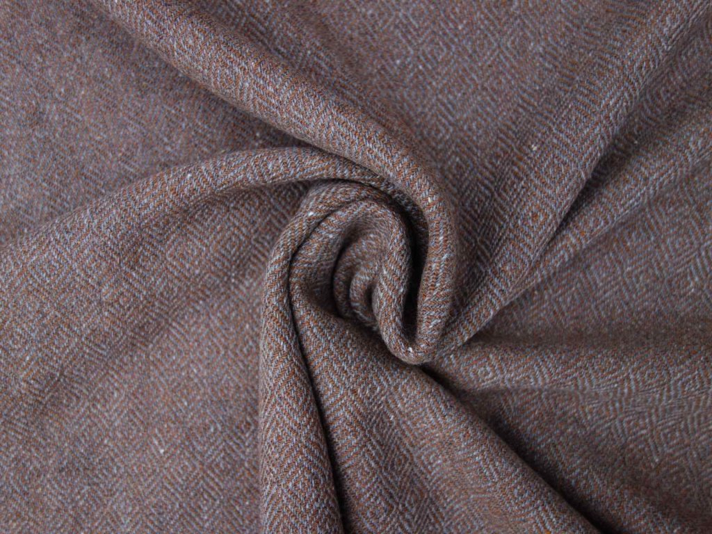 Thicker woolen diamond twill weaved from medium brown and grey yarns.